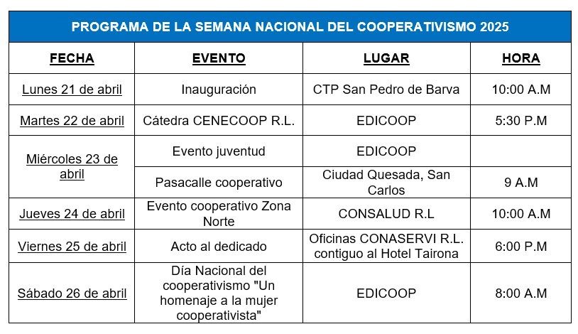 Un pasacalles recorrerá las calles de Ciudad Quesada el 23 de abril a las 9:00 a.m. El 24 de abril se relanzará el Hospital Cooperativo de Consalud. El cierre de la semana, el 26 de abril, Día Nacional del Cooperativismo, se realizará un homenaje a las mujeres cooperativistas en el Edificio Cooperativo en San Pedro a las 8:00 a.m.