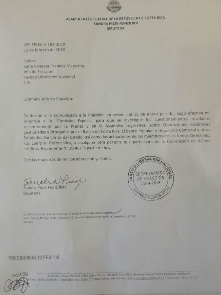 Por otra parte, la diputada liberacionista, Sandra Piszk envió su carta de renuncia, esta tarde, a la jefa fracción liberacionista, Karla Prendas.