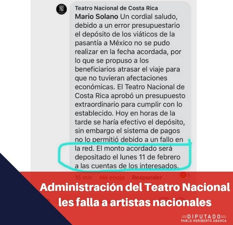 “Es grave que el coordinador del Departamento de Promoción Cultural, Alexandro Tosatti, haya prometido realizar el pago en varias ocasiones y sin materializarlo, dando largas y excusándose con los ganadores. ¿Estará efectivamente el Teatro Nacional jugando con las expectativas de los artistas que participaron en el mencionado concurso?”, dijo el congresista.