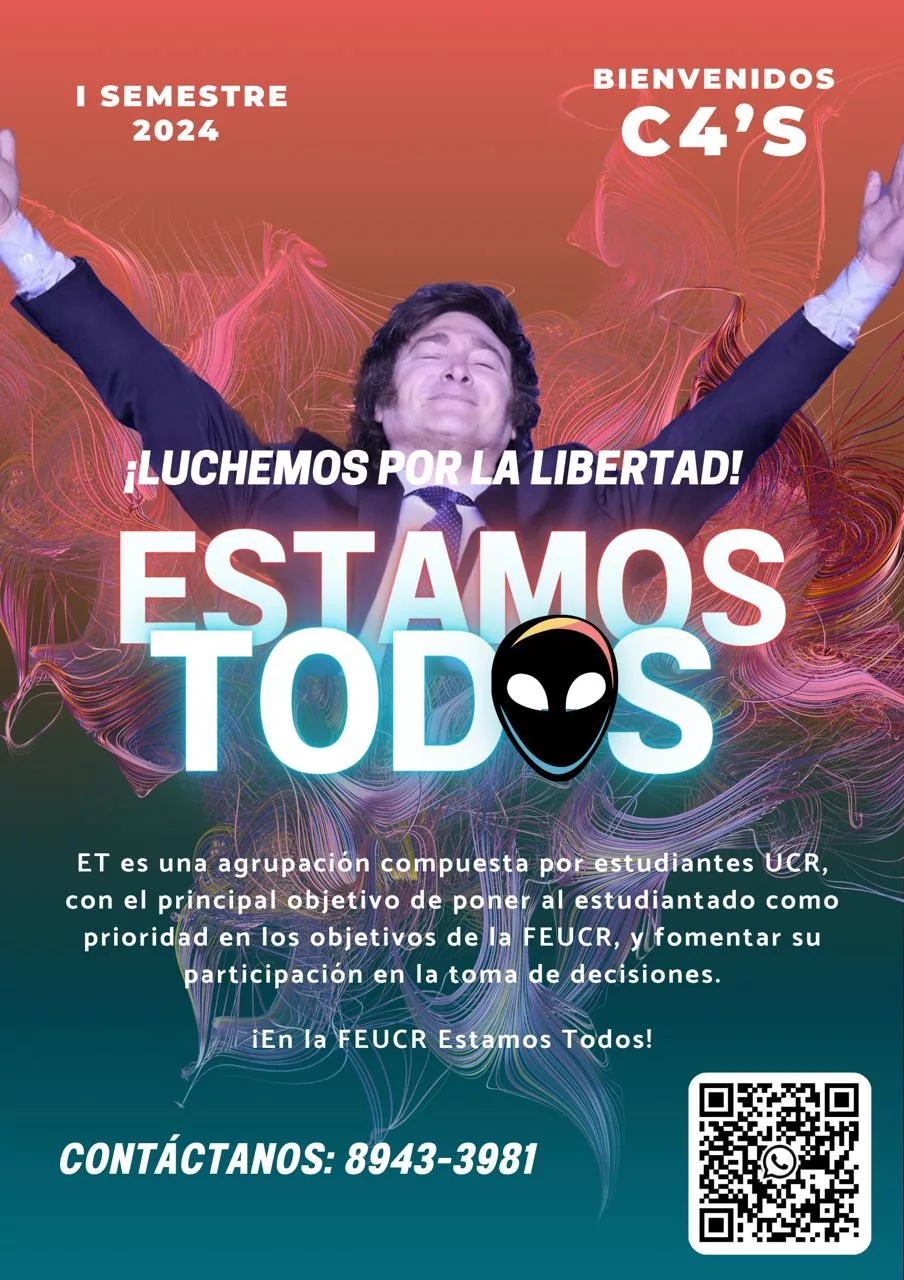 San José, 12 mar (elmundo.cr) – El partido federativo Estamos Todos (ET) de la Universidad de Costa Rica (UCR) utiliza la imagen del presidente de Argentina, Javier Milei, para dar la bienvenida al curso lectivo 2024.