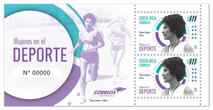 Está compuesta por un mini pliego con dos sellos postales cuya protagonista es la fondista Thelma Zúñiga Álvarez, una de las máximas referencias femeninas en competencias de larga distancia. Entre sus múltiples logros, destaca la medalla de oro que obtuvo en los II Juegos Centroamericanos El Salvador en 1977, donde impuso una nueva marca en 1.500 metros.