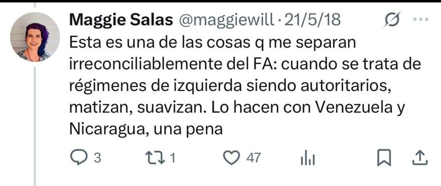 Para críticos del Frente Amplio, la inclusión de Salas no solo evidencia incongruencia, sino que también refleja la falta de una línea clara frente a regímenes autoritarios de izquierda en la región. El giro en el discurso de quien antes los señalaba con firmeza, y que ahora representa al partido que ella misma cuestionaba, se percibe como una muestra más de la flexibilidad ideológica con la que se manejan ciertas candidaturas.