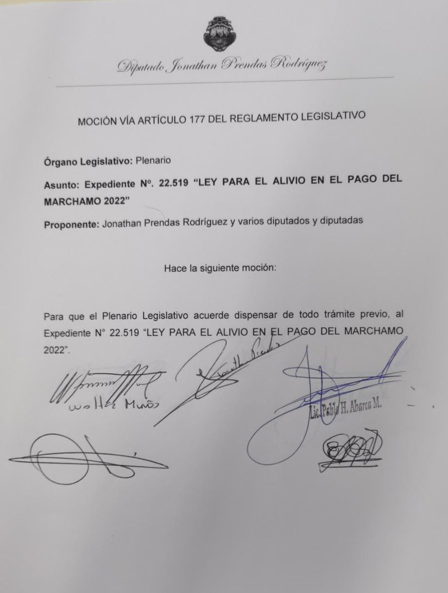 La iniciativa que se encuentra bajo el expediente 22.519 “Ley para el alivio en el pago del marchamo 2022”, fue presentada por la diputada liberacionista Franggi Nicolás junto al diputado Dragos Dolanescu.