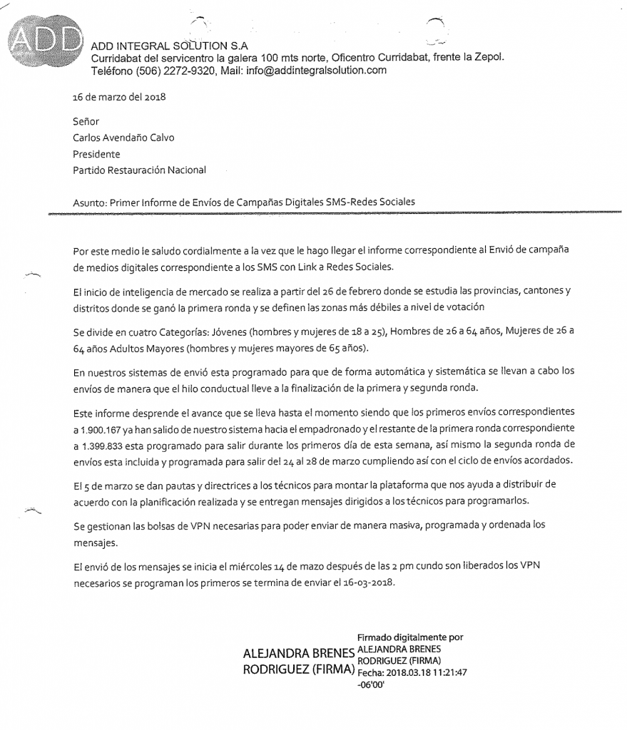 El contrato lo suscribió Add Integral Solution, una empresa de Corporación SPI perteneciente a Luis Diego Garro Sánchez y a Alejandra Brenes Rodríguez, exsubtesorero del PRN y excandidata a diputada de la misma agrupación política, respectivamente. Garro renunció al partido solo unos días antes de firmar los millonarios contratos con Carlos Avendaño.