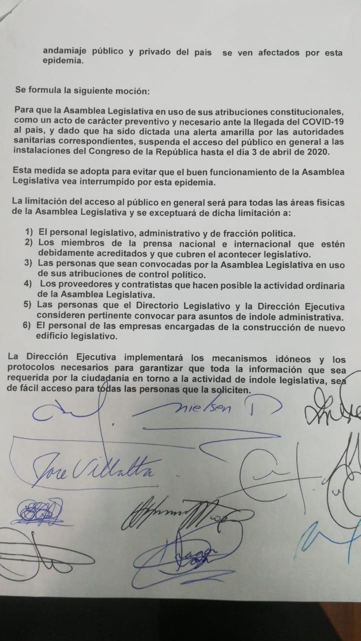 San José, 12 mar (elmundo.cr)- Los diputados aprobaron una moción este jueves para suspender la entrada de público a la Asamblea Legislativa debido a la pandemia del coronavirus.