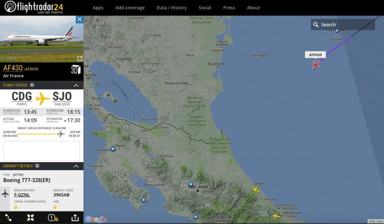 San José, 2 nov (elmundo.cr) – El vuelo de Air France 430 que partió del Aeropuerto Charles de Gaulle de París, en Francia aterrizará en Costa Rica a eso de las 17:30 horas de este miércoles.