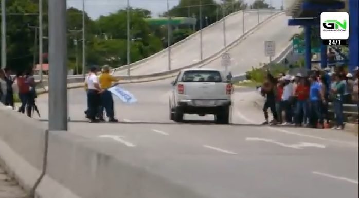Un vídeo difundido por la página de Facebook del medio regional Guana/Noticias captó el momento cuando el vehículo se da a la fuga luego de atropellar a tres manifestantes.