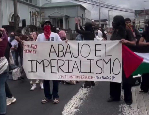 Durante la manifestación, los participantes portaban diversas banderas y símbolos, entre ellos alusivos a Palestina, al Frente Amplio y a corrientes de izquierda, mientras se mantenían en las vías impidiendo el paso vehicular por varios momentos.