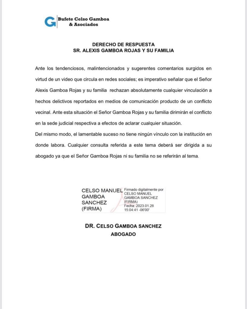 “Es imperativo señalar que el señor Alexis Gamboa Rojas y su familia rechazan absolutamente cualquier vinculación a hechos delictivos reportados en medios de comunicación producto de un conflicto vecinal”, se lee en el comunicado.