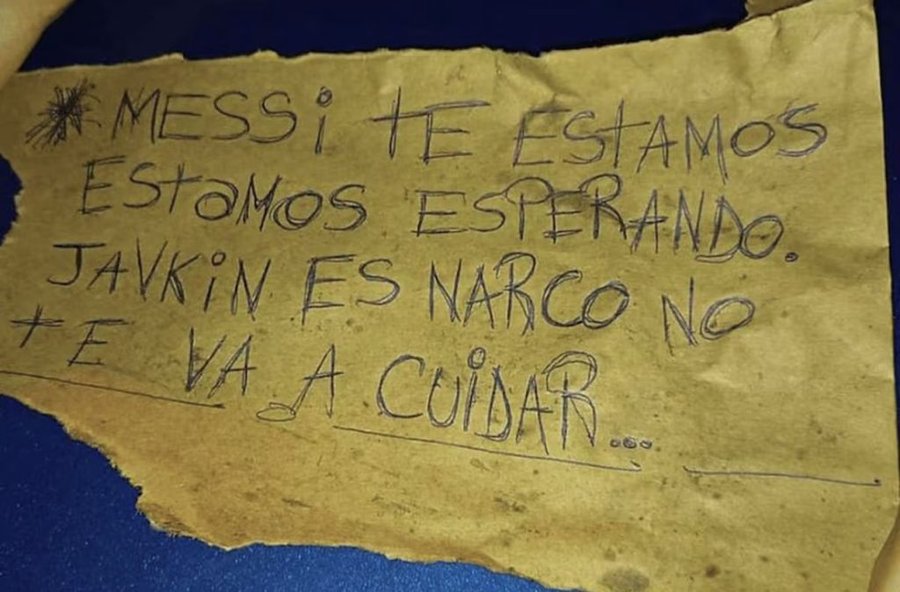 “Messi, te estamos esperando. Javkin (alcalde de la ciudad) es narco, no te va a cuidar”, se lee en la cartulina que dejaron.