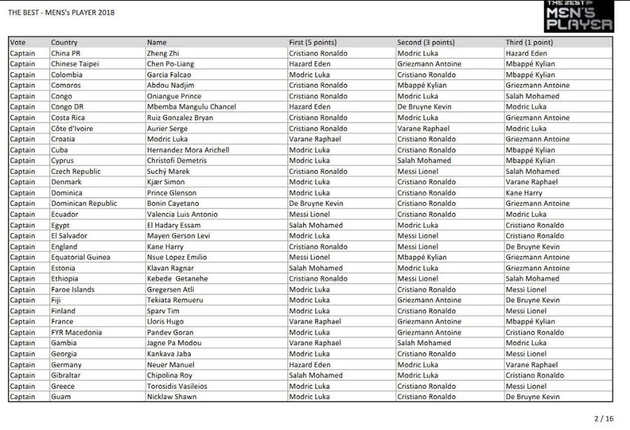 El capitán otorgó el primer lugar a la estrella portuguesa Cristiano Ronaldo, mientras que ubicó en el segundo puesto a Luka Modric, futbolistas que terminaría ganando el premio “The Best” por su gran participación en el Mundial de Rusia 2018, donde guió a su selección hasta el sub campeonato.