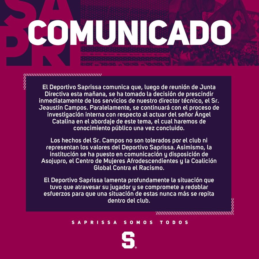 Los morados argumentaron en un nuevo comunicado que los “hechos del Sr. Campos no son tolerados por el club ni representan los valores del Deportivo Saprissa”.