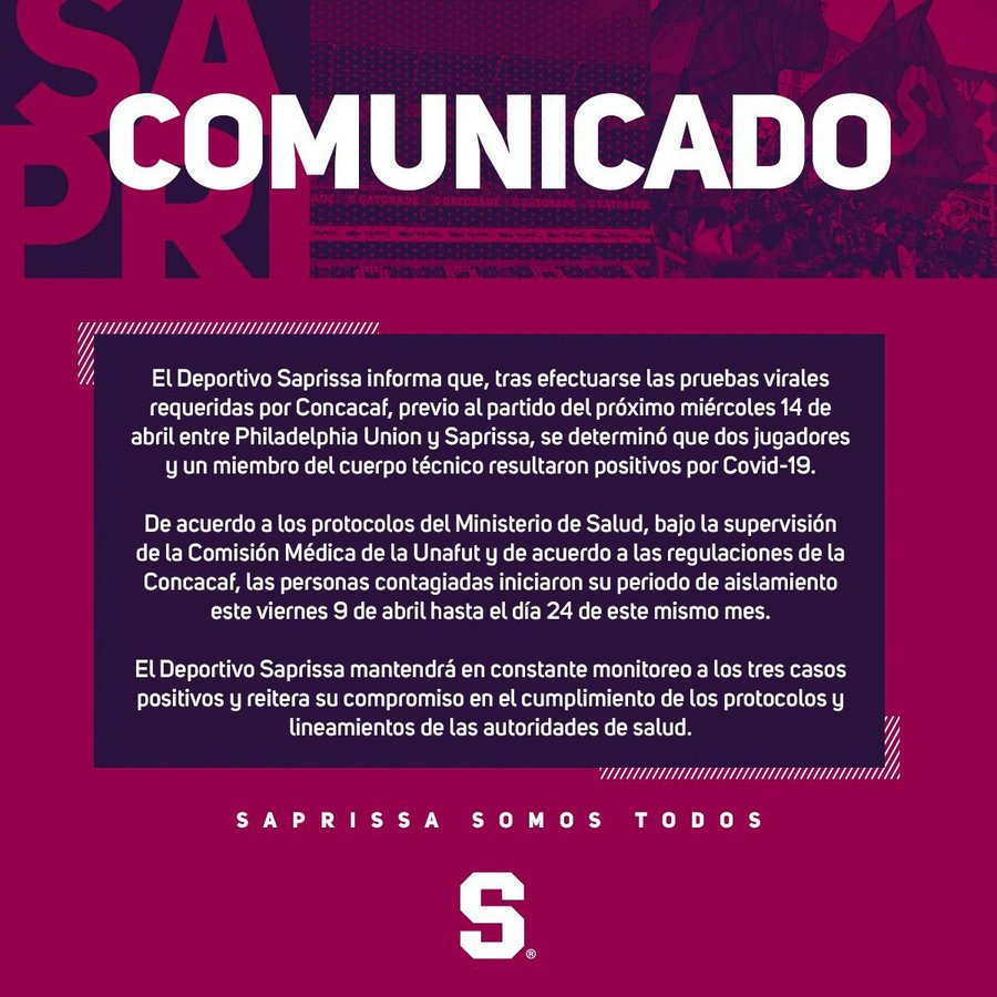 El Saprissa comunicó el pasado sábado 10 de abril que tres de sus integrantes no estarían para el juego ante Pérez Zeledón por resultar positivos al virus SARS-CoV-2 que produce la covid. El equipo no hizo oficial los nombres pero los medios de comunicación revelaron que se trata de los jugadores Mariano Torres y Fabricio Alemán; además del secretario técnico José Francisco Porras.