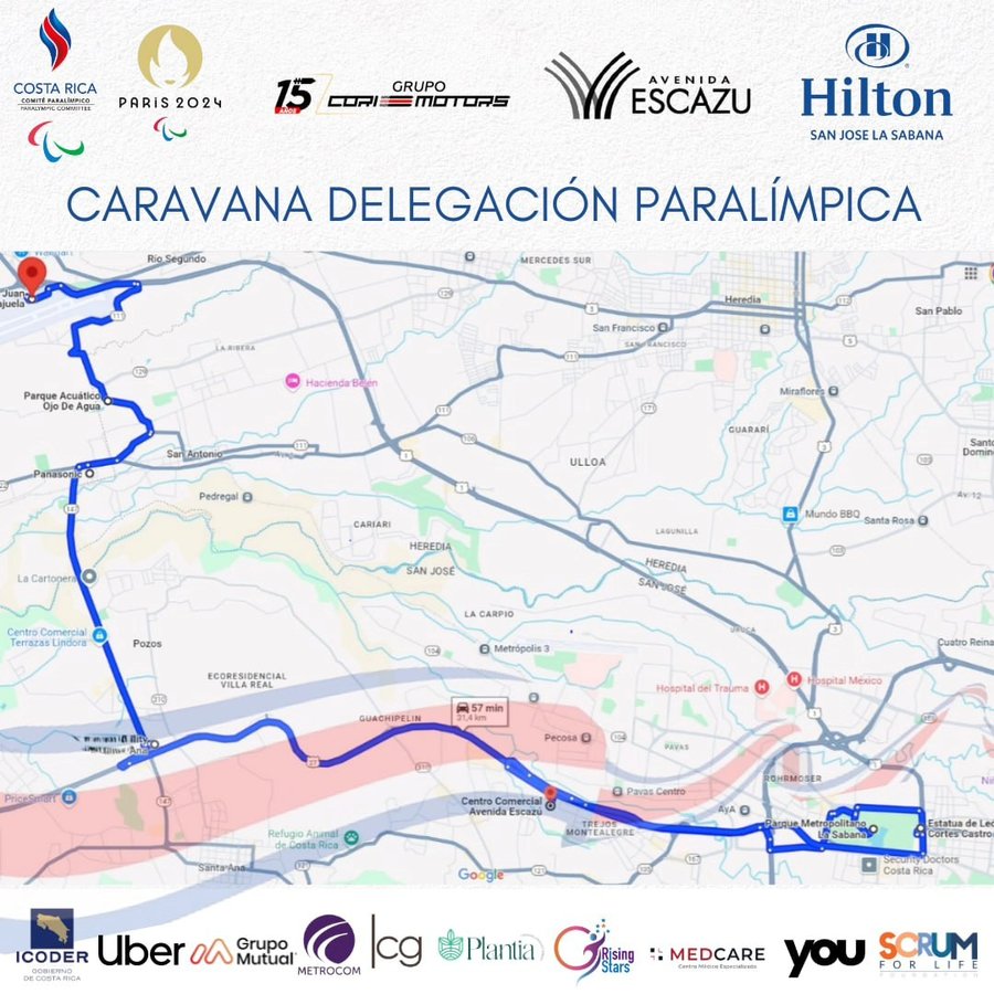 El recorrido ruta previsto que arranque a las 5:00 p.m. del Aeropuerto Juan Santamaría, dirigiéndoselo a Belén por la ruta del Parque de Ojo de Agua, llegaran hasta la Panasonic, para luego seguir por Lindora hasta la Ruta 27, donde seguirán hacia San José.
