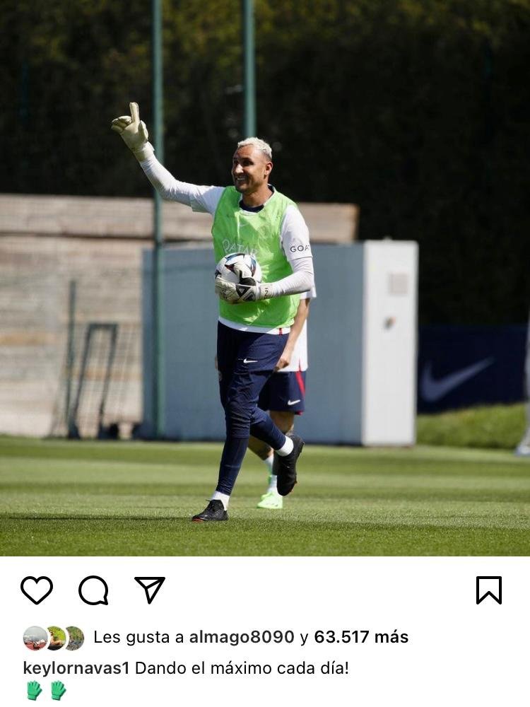Keylor Navas sigue entrenando con el París Saint Germain y mientras su futuro se decide ha posteado una fotografía donde está entrenando y recalca que su compromiso con el equipo parisino sigue igual que al principio que llegó al club.