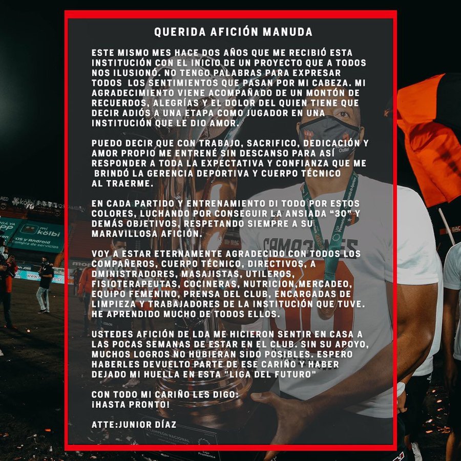 “Ustedes afición me hicieron sentir en casa desde las pocas semanas que llegué al club. Sin su apoyo muchos logros no hubieran sido posibles, espero haberles devuelto parte de ese cariño y haber dejado mi huella en esa Liga del Futuro”, dijo Díaz en un sentido texto que compartió en sus redes sociales.