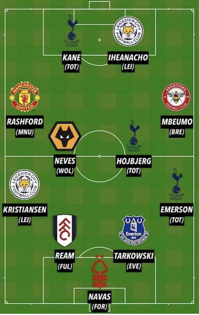 El resto del equipo ideal lo completan, Kristiansen, Ream, Tarkowski, Emerson, Rashford, Neves, Hojbjerg, Mbeumo, Kane y Iheanacho.