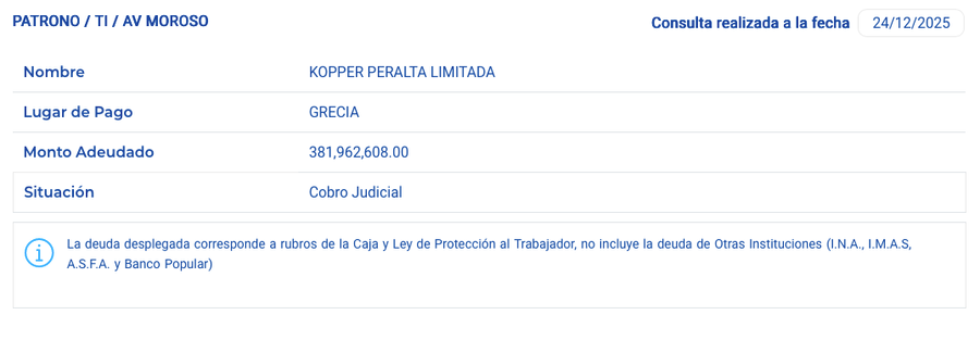 Además de los procesos laborales, Kopper Peralta Limitada aparece como morosa ante la Caja Costarricense de Seguro Social por un monto de ₡381.962.608, suma que se encuentra en proceso de cobro judicial, según consta en registros oficiales consultados por este medio.