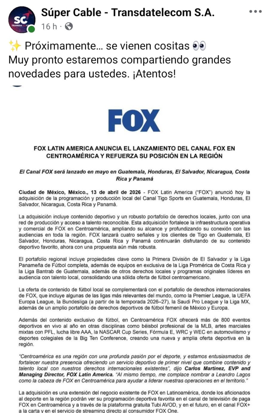 El propio anuncio que dĆas atrĆ”s realizó FOX Latin America respalda esa posibilidad. La compaƱĆa confirmó que lanzarĆ” cuatro nuevas seƱales en la región, tras la adquisición de la programación y producción local de Tigo Sports en CentroamĆ©rica.