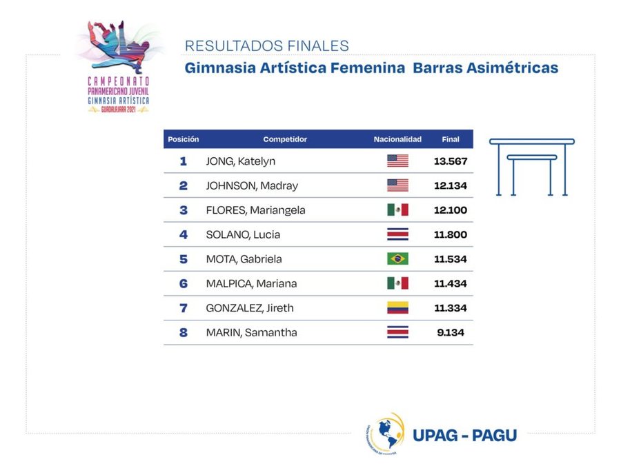 San José, 20 jun (elmundo.cr) – La gimnasta costarricense Lucía Solano Oconitrillo, de tan solo 13 años, logró el cuarto lugar en el Panamericano Juvenil de Gimnasia Artística que se celebra en Guadalajara, en la especialidad de barras asimétricas.