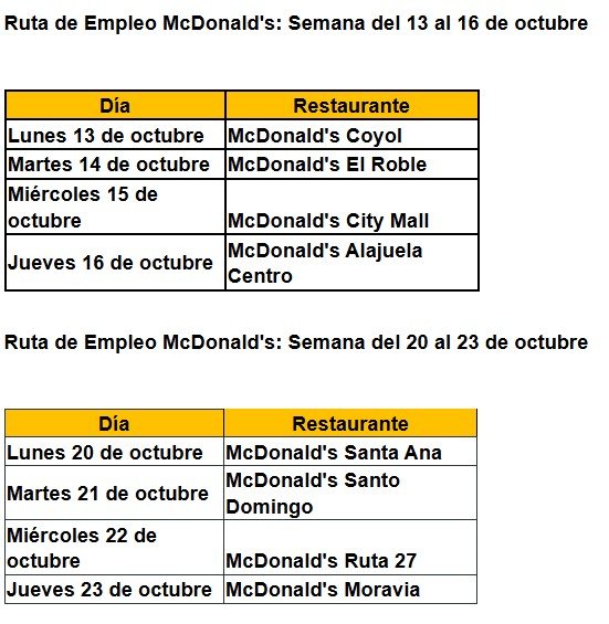 “Con la Ruta de Empleo buscamos brindar una opción accesible y cercana, que resulta especialmente valiosa para quienes desean obtener su primer empleo formal, así como para todas aquellas personas que están en búsqueda de trabajo. Esta iniciativa les permite aclarar dudas y aplicar directamente en los restaurantes”, explicó Marianela Ureña, gerente de Comunicaciones de Arcos Dorados Costa Rica.
