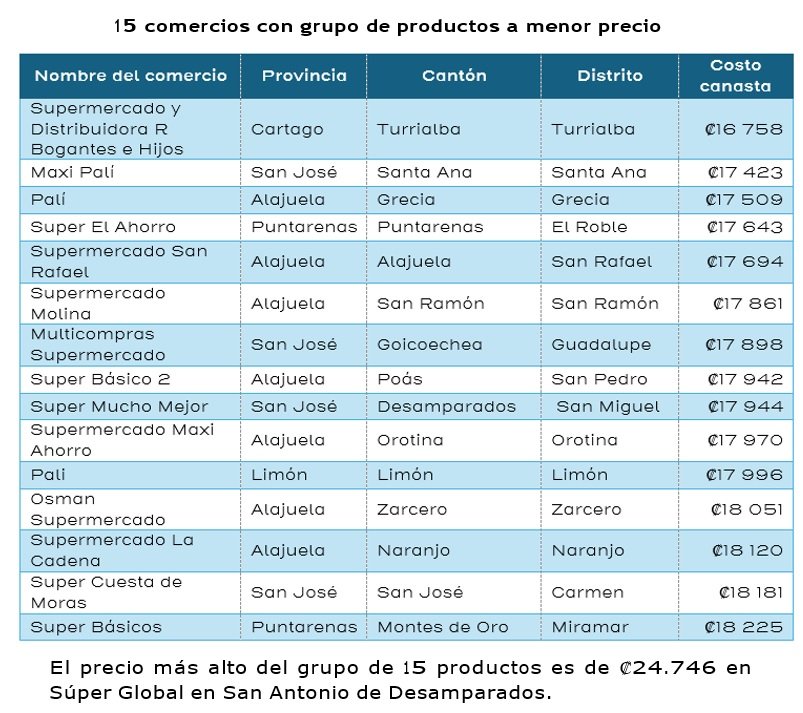De este grupo de 15 productos, se encontró que el precio más barato es de ₡16.758 en el Supermercado y Distribuidora R Bogantes e hijos en Turrialba.