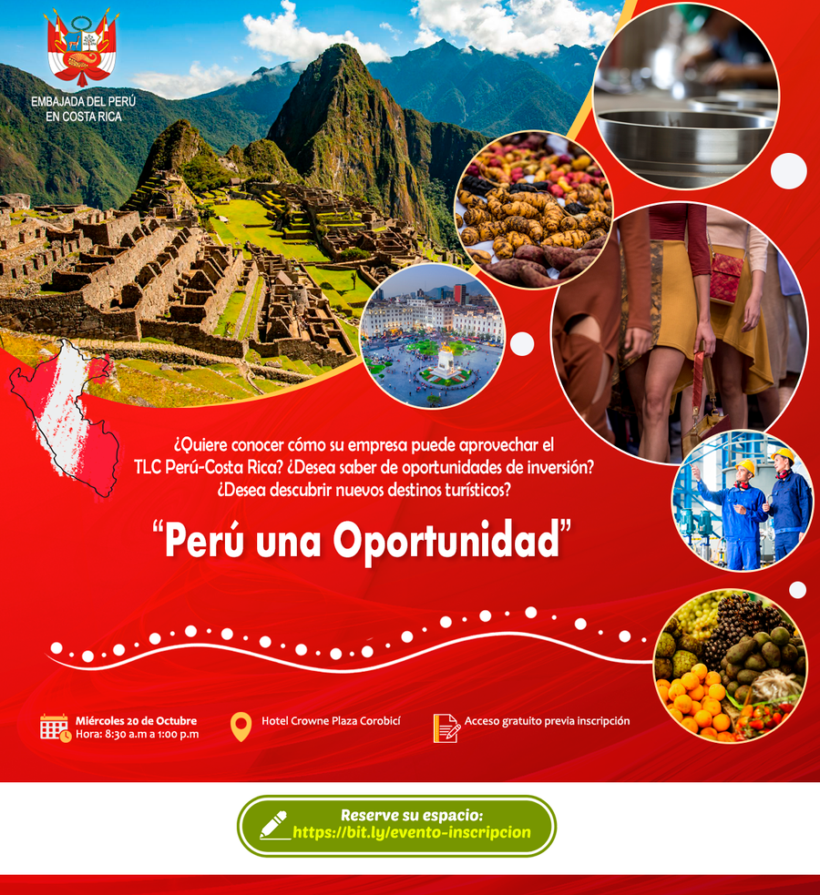 San José, 7 oct (elmundo.cr) – En el marco del Bicentenario del Perú y en la conmemoración del establecimiento de las relaciones diplomáticas entre el Perú y Costa Rica, la Embajada del Perú realizará el evento “Perú una Oportunidad”.