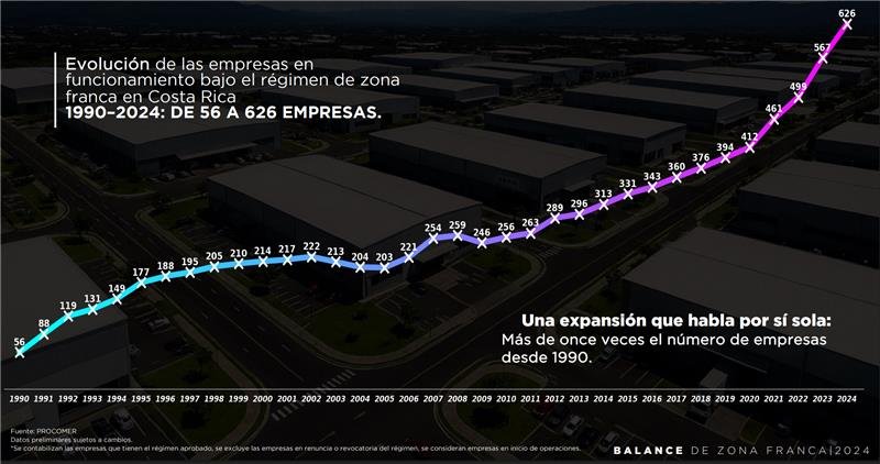 Desde su implementación en 1990, el régimen mantiene un crecimiento sostenido en su cobertura y alcance, pasando de 56 empresas en operaciones productivas a 626 en 2024. Además, la contribución absoluta del RZF con relación al PIB durante ese periodo, pasó del 1% al 15%. Este dinamismo ha permitido que empresas nacionales y multinacionales, encuentren un entorno competitivo y estable para operar, con casos que superan las tres décadas de operación.