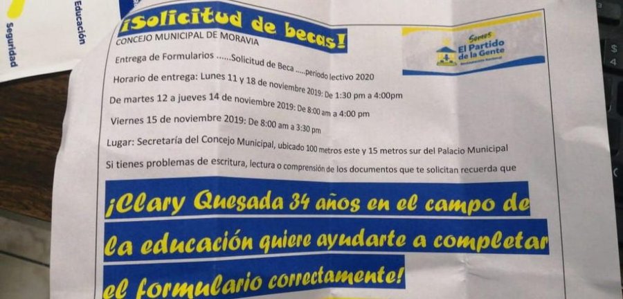 San José, 14 nov, (elmundo.cr)- La candidata a vicealcaldesa de Moravia, por el Partido Restauración Nacional, Clary Quesada, utiliza los formularios de becas que la Municipalidad de este cantón entrega para hacer propaganda previo a las elecciones municipales del 2020.