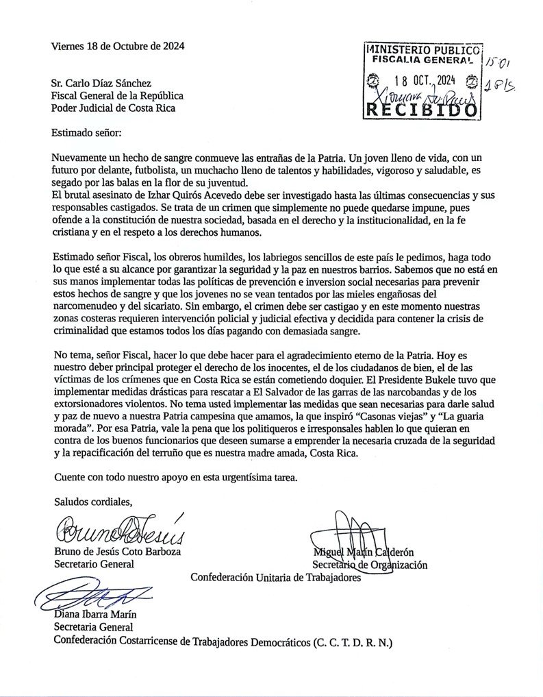 San José, 21 sep (elmundo.cr) – La Confederación Unitaria de Trabajadores (CUT) envió una carta al fiscal general, Carlo Díaz, exigiendo una investigación exhaustiva por el asesinato del joven futbolista Izhar Quirós Acevedo, un crimen que ha conmocionado al país y que, según la organización, no puede quedar impune.