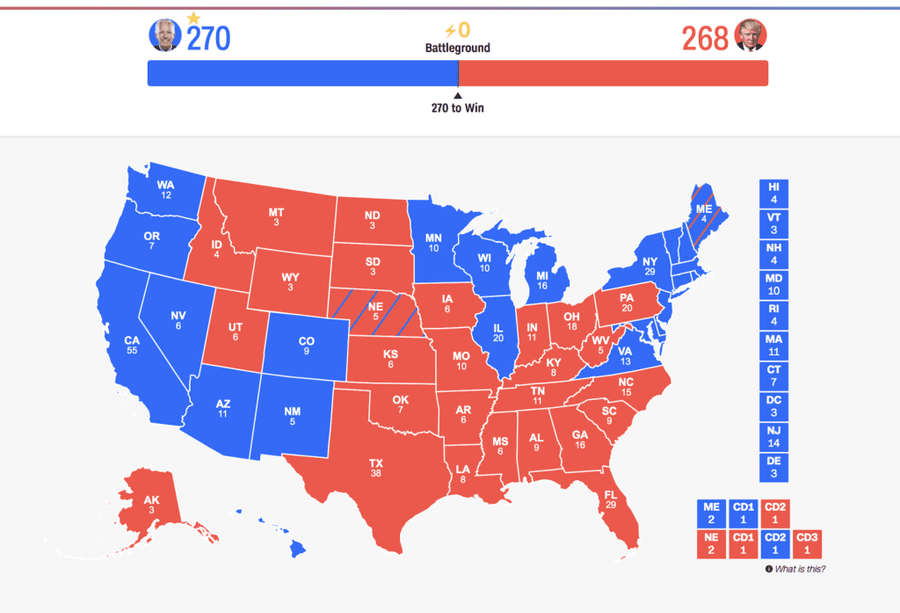 La clave actual se centra en los estados industriales del norte, Wisconsin y Michigan, donde se mantienen los resultados prácticamente empatados con ventaja leve para Joe Biden. Además Trump tiene una escasa ventaja en Georgia y Carolina del Norte. Estos cuatro estados serían claves y de mantenerse esas ventajas actuales el demócrata ganaría en el Colegio Electoral con la diferencia mínima (270 – 268).