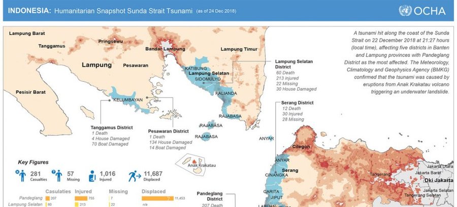En una actualización alrededor de las 7 de la mañana hora local, OCHA informó que había más de 280 muertos, más de 1000 heridos, más de 50 personas desaparecidas, y cerca de 12.000 desplazados por el tsunami.