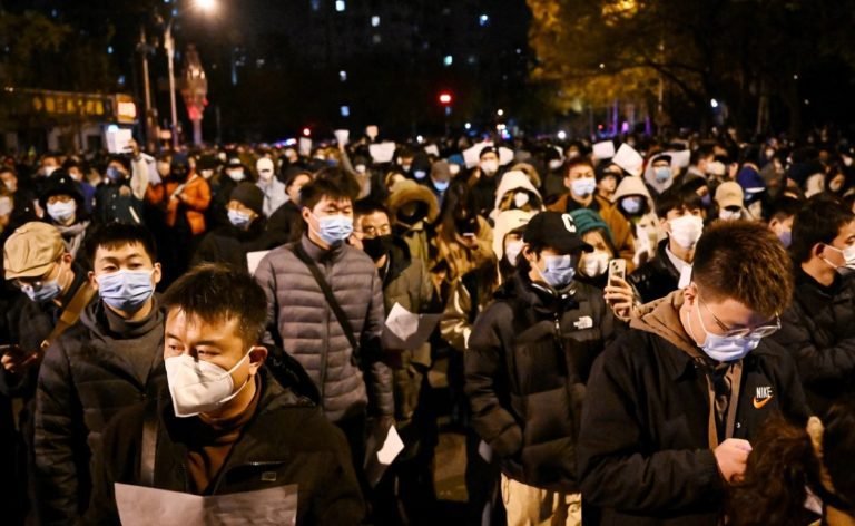Los residentes de la ciudad más grande de China gritaban consignas como “Xi Jinping, renuncia” y “Partido Comunista, renuncia” y otros llevaban carteles en blanco.