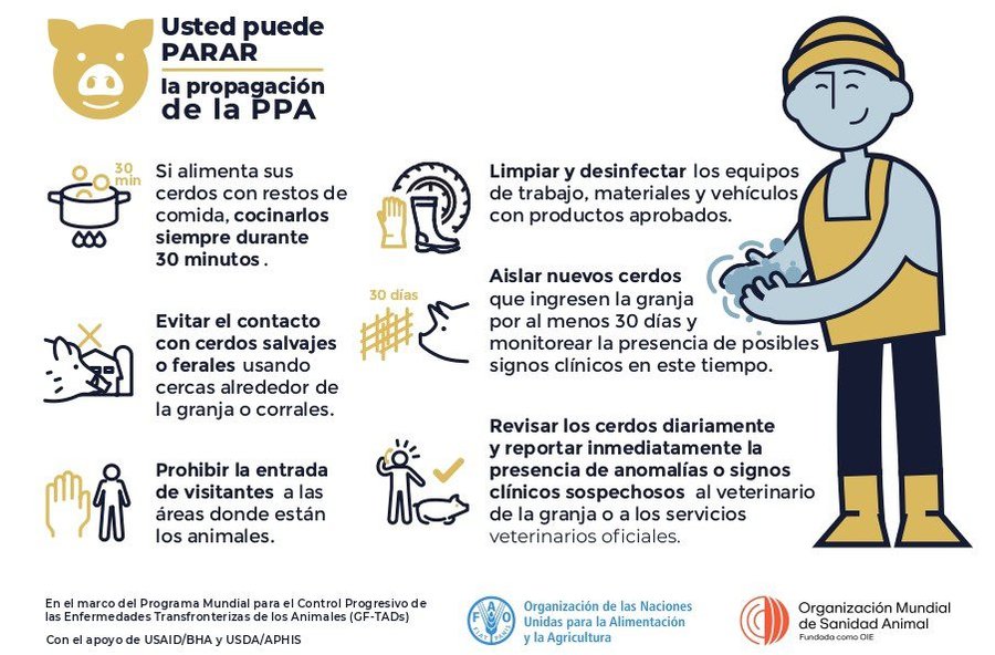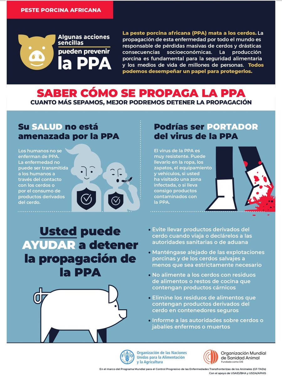 La acción coordinada contra la PPA la desarrollan junto a la FAO, la Organización Mundial de Sanidad Animal (OMSA) y organismos internacionales, entre ellos: el Instituto Interamericano de Cooperación para la Agricultura (IICA), el Organismo Internacional Regional de Sanidad Agropecuaria (OIRSA), la Comunidad Andina (CAN), the Caribbean Animal Health Network (CARIBVET) y la Caribbean Agriculture Health and Food Safety Agency (CAHFSA), en el marco de la estrategia del Programa Global de Enfermedades Animales Transfronterizas (GF-TAD).