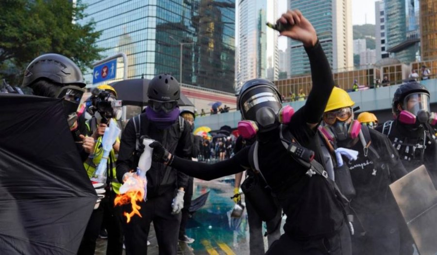 Miles de manifestantes antigubernamentales, muchos vestidos con máscaras negras, gorras y sombreros para ocultar su identidad, corrieron por las calles, participaron en tácticas del gato y el ratón con la policía, incendiaron calles y bloquearon carreteras en el corazón de Hong Kong, donde se encuentran muchos distritos comerciales clave.