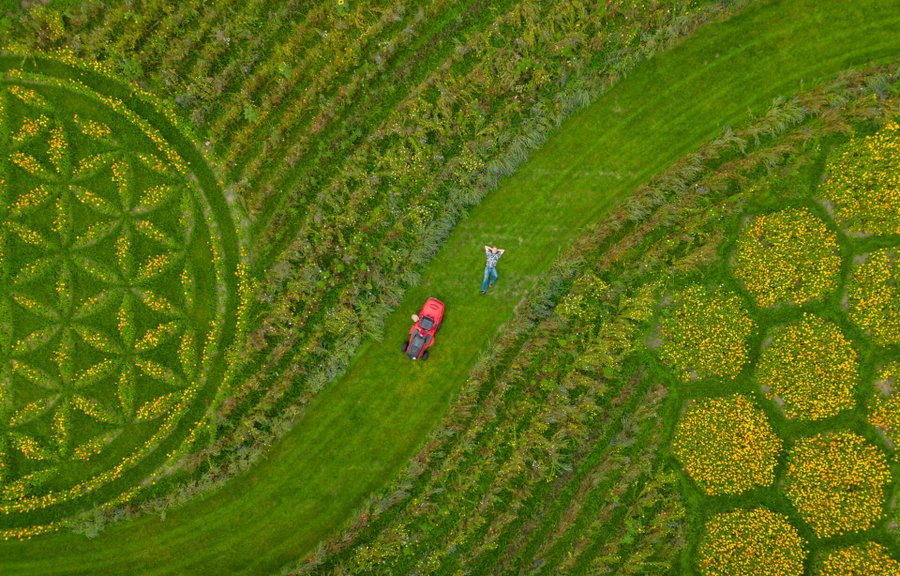 El artista plantó y sembró diferentes flores y plantas en flor para crear imágenes hiperdimensionales con formas de abejas, panales y el ornamento “Blumen des Lebens” (Flores de la vida).