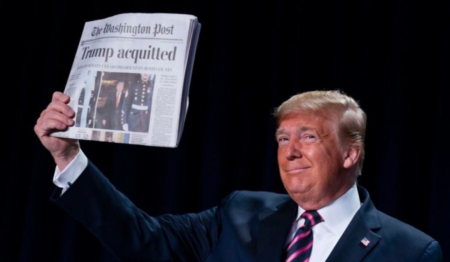 Cuando Trump entró en la habitación del Washington Hilton y fue a tomar asiento, sonrió y mostró copias de USA Today y The Washington Post, cada una con titulares sobre el veredicto del Senado. Miembros de la audiencia se rieron y aplaudieron.