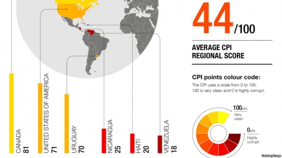 El Índice de Percepción de la Corrupción (IPC) para 2018, elaborado por la ONG Transparencia Internacional, mostró que más dos tercios de los países tienen una puntuación de menos de 50 puntos en una escala donde 100 equivaldría a una nación muy limpia y cero a una muy corrupta.
