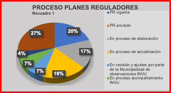 En estos momentos, de las 84 Municipalidades, solo el 20% tiene un Plan Regulador vigente, el 17% está en proceso de elaboración, y el 18% está en proceso de actualización.