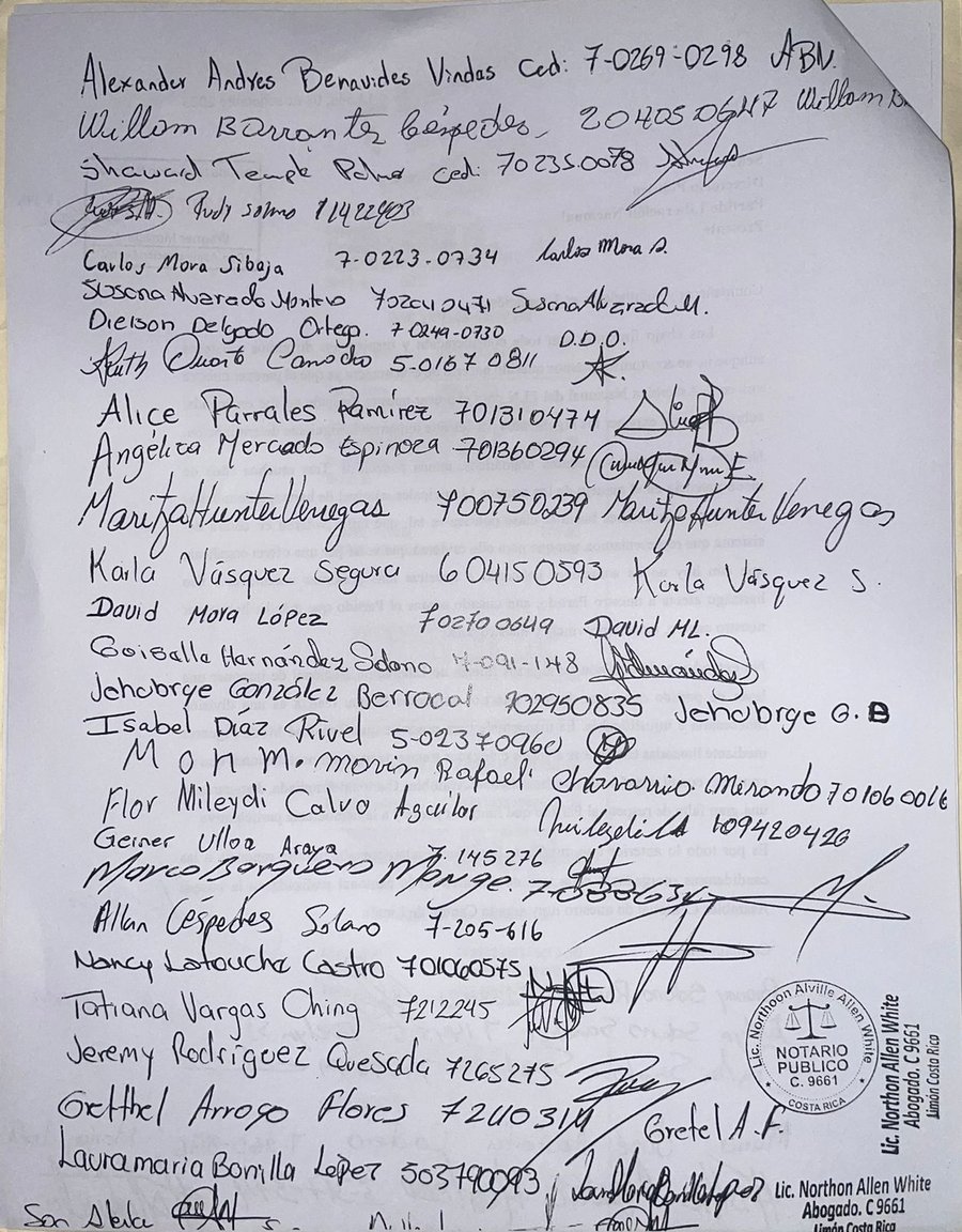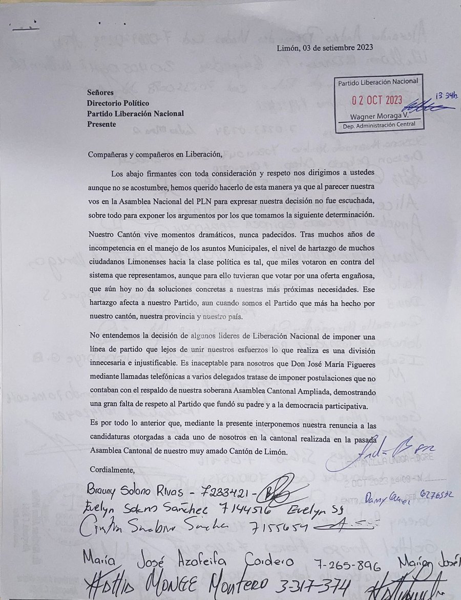 “Es por todo lo anterior que, mediante la presente interponemos nuestra renuncia a las candidaturas otorgadas a cada uno de nosotros en la cantonal realizada en la pasada Asamblea Cantonal de nuestro muy amado cantón de Limón”, concluyen.
