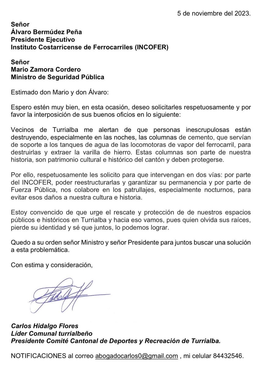 Cartago, 5 nov (elmundo.cr) – El candidato a alcalde del Partido Nueva Generación (PNG), Carlos Hidalgo Flores, solicitó la intervención del Incofer y del Ministerio de Seguridad Pública para resguardar parte del patrimonio del cantón de Turrialba.