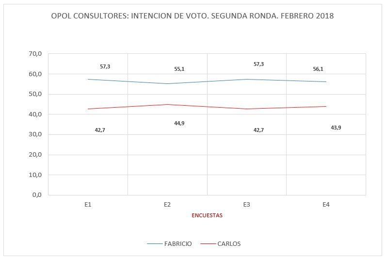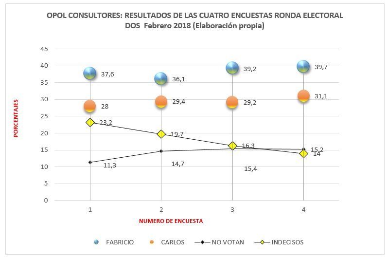 En el análisis de las encuestas realizadas por OPol Consultores en las elecciones del 4 de febrero hice referencia a que dada la incertidumbre existente por la cantidad de indecisos y personas que no votan, había que esperar en que momento “saltaba la liebre” y así fue. Era evidente que Carlos Alvarado crecía, mientras que Desanti y Juan Diego Castro, uno crecía de forma decreciente y el otro decrecía. El trabajo de OPol Consultores permitía tales proyecciones. Hoy, con solo dos candidatos, tal situación es más difícil que se presente, dado que la diferencia entre ambos candidatos es muy estable. En la primera la diferencia era de 14.6 puntos porcentuales (PP.), esta semana fue de 12.2 PP. En promedio la diferencia en las cuatro encuestas es de 13.4 PP.