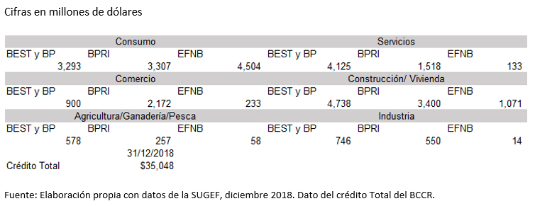 Por otro lado, apoyando el desarrollo del país, la colocación del crédito ha evolucionado conforme el cambio en la estructura económica (ver tabla siguiente). Según las cifras de la Superintendencia General de Entidades Financieras (SUGEF), a diciembre 2018, los bancos estatales y banco Popular (BEST y BP) colocaron el 12% del crédito total en servicios, sector medular de la estructura productiva y fuente de empleos (servicios pasó de representar un 20% en 1991 a 41% del PIB en el 2018), el 4% para los bancos privados y apenas el 0,4% para el resto de las entidades financieras no bancarias. En servicios se colocó US$5.775 millones durante el 2018, 71% provenían de la banca estatal.