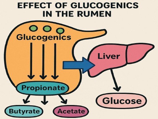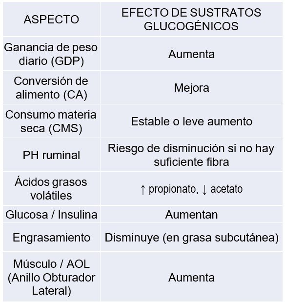 Encontrando que los sustratos glucogénicos, al promover un aumento de la síntesis de glucosa en el rumen, pueden mejoran la eficiencia energética y reducir la acumulación de grasa intramuscular no deseada. Los resultados preliminares indican que dietas con menor inclusión de lípidos animales y mayor proporción de carbohidratos fácilmente fermentables pueden mejorar la ganancia diaria de peso sin comprometer la salud ruminal ni la calidad de la carne. Los sustratos glucogénicos aportan carbohidratos fácilmente fermentables en el rumen, lo que aumenta la producción de propionato, un ácido graso volátil clave para la síntesis de glucosa en el hígado. Como influyen en las variables productivas, la fisiología y salud y la canal.