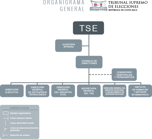 Es decir que durante el segundo semestre del año 2016 un numero sumamente importante de la planilla laboral del TSE reportó incapacidades para un total de días de incapacidad de once mil quinientos veintinueve (más de sextuplicar su propia planilla laboral al punto de un promedio de incapacidad de 14,26 días de incapacidad por persona funcionaria, población laboral muy enferma), del total de funcionarios evaluados, poco más de la mitad lograron una calificación de excelente, el resto fueron calificados con un muy bueno, satisfactorio, bueno y solo un insuficiente, también si observamos el mismo organigrama de estructura jerárquica del TSE, vemos que cuenta con un muy robusto sistema de Direcciones Generales y una Dirección Ejecutiva ( y cada una de estas dependencias con varios departamentos, secretarías y así varios funcionarios (as), tal y como se muestra a continuación: