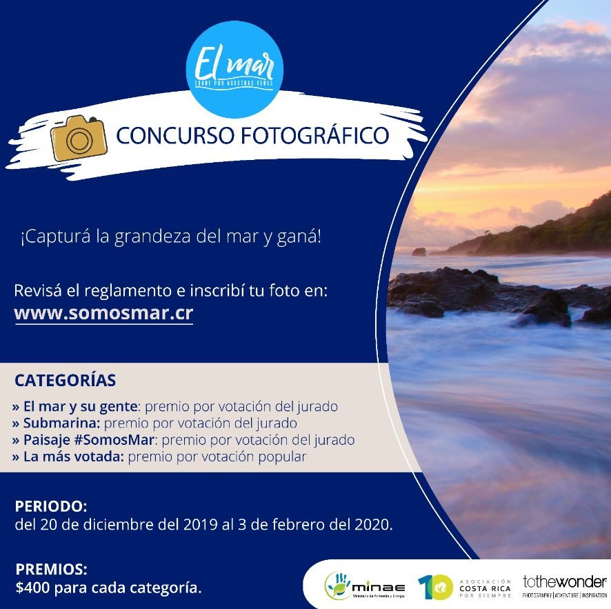 “Las personas pueden inscribir sus fotografías, a más tardar el 3 de febrero, en el formulario disponible en el sitio www.somosmar.cr, de manera gratuita. Quien gane en cada categoría recibirá un premio en efectivo de $400”, indicó Zdenka Piskulich, Directora Ejecutiva de la ACRXS.