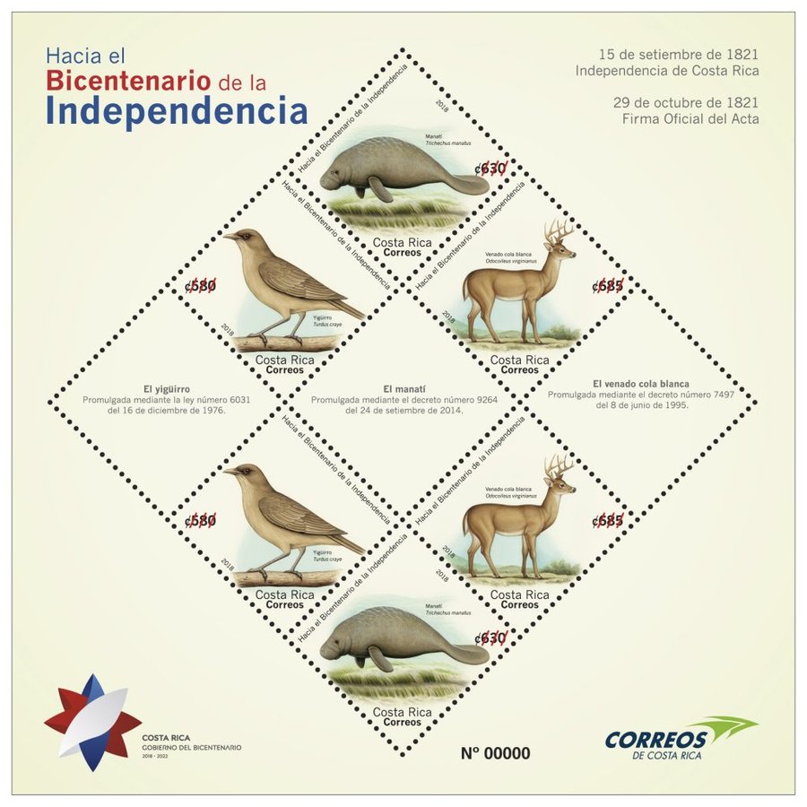 San José, 13 set (elmundo.cr) – Correos de Costa Rica se une desde ya a la gran celebración del Bicentenario de la Independencia de Costa Rica, por ello, la mañana de este jueves 13 de setiembre, presentó la segunda entrega de la colección postal “Hacia el Bicentenario de la Independencia”, la cual destaca las bellezas de la fauna costarricense representada en tres símbolos patrios: el yiguirro, el manatí y el venado cola blanca.