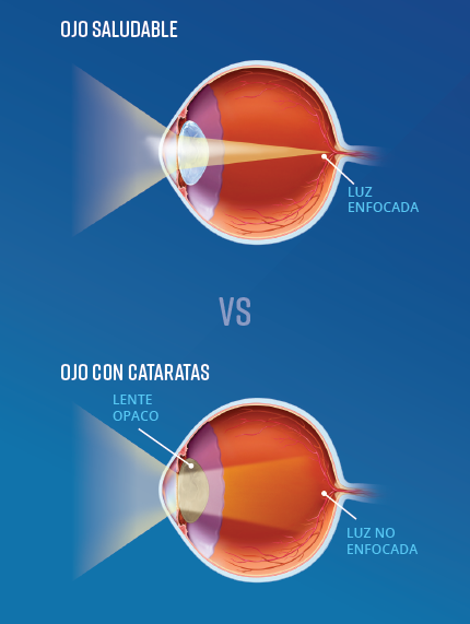 Las cataratas se desarrollan de forma progresiva con el paso del tiempo y afectan el lente natural del ojo, lo que provoca que la vista se vuelva borrosa, nublada o menos nítida. Este proceso puede acompañarse de disminución en la agudeza nocturna, sensibilidad a la luz, dificultades para leer, necesidad frecuente de cambiar la graduación de los anteojos, percepción opaca de los colores o incluso visión doble en uno de los ojos.