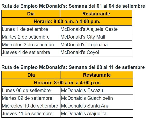 San José, 31 ago (elmundo.cr) – Arcos Dorados, franquicia que opera la marca McDonald’s en América Latina y el Caribe, continúa en setiembre con su “Ruta de Empleo”, un espacio que acerca oportunidades laborales de forma directa y accesible. Este mes, la iniciativa se realizará en restaurantes de Alajuela y el Oeste del Gran Área Metropolitana (GAM).