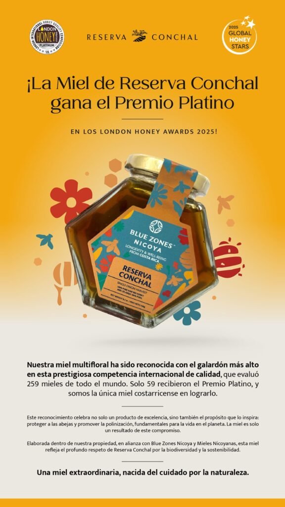 San José, 29 jun (elmundo.cr) – Reserva Conchal obtuvo el más alto reconocimiento internacional en los London Honey Awards 2025, al recibir el Premio Platino por la calidad excepcional de su miel multifloral. Esta distinción posiciona a la miel de Reserva Conchal entre las mejores del mundo y convierte a Costa Rica en un referente global de producción apícola sostenible.